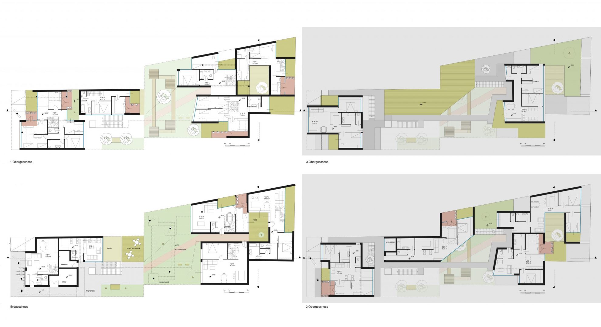 The essential concept of the floor plans are the courtyards, terraces and balconies, assigned to the children‘s rooms. For the children‘s rooms we differentiate 3 types: