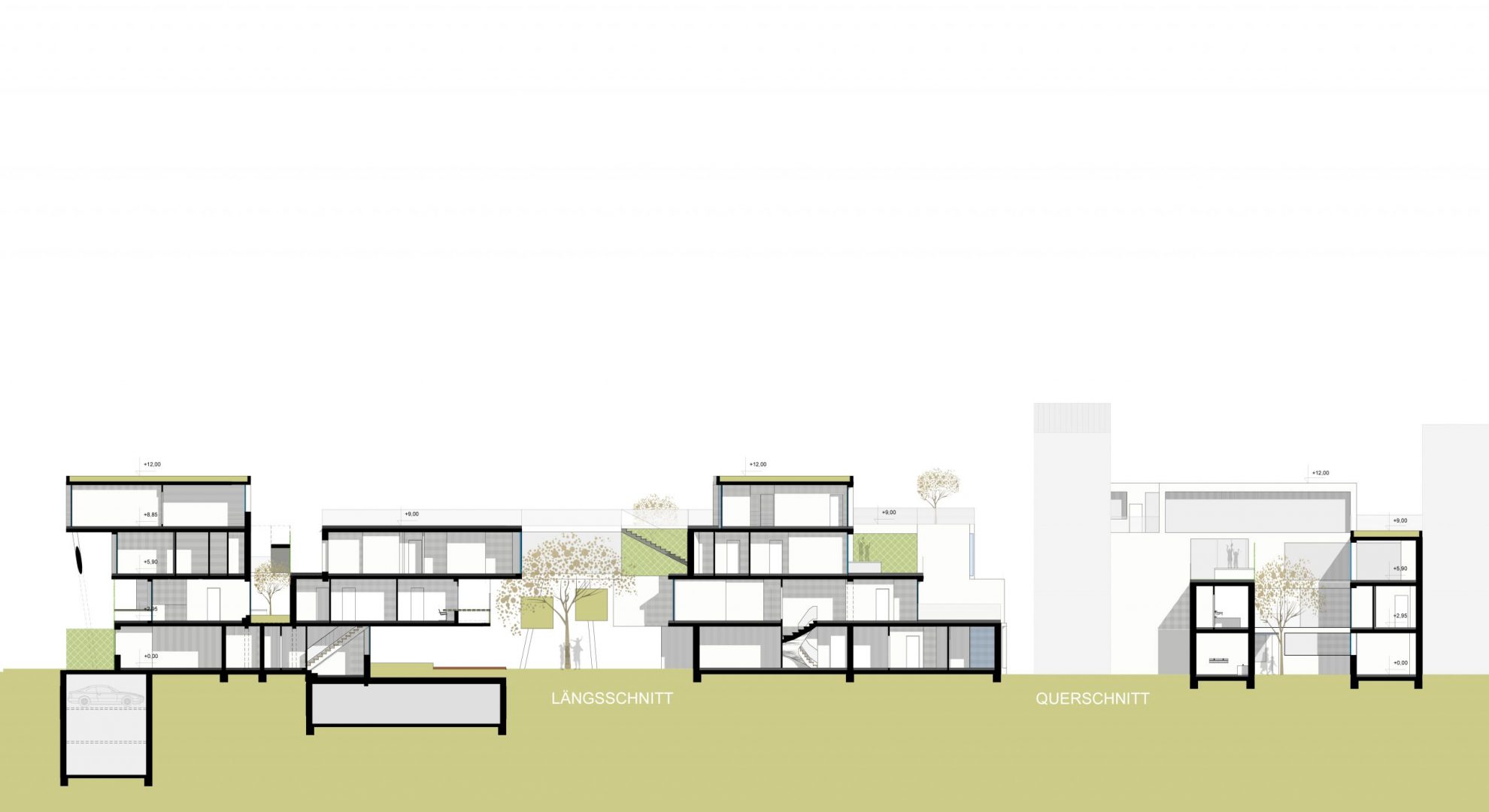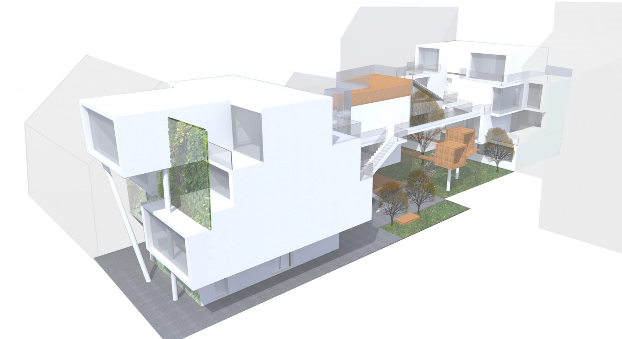 The basic idea and the form of the building is based on considerations of privacy and exposure. By moving the individual levels, we create private courtyards, balconies and terraces, which is an added value for the family and especially the children. A direct connection of the child‘s room to the terrace, courtyards and balconies increases additionally the quality of living.
