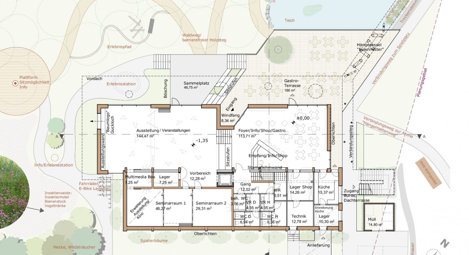 Das Gebäude reagiert mit seiner abgestuften Bauweise auf die Hangsituation und bietet dadurch neben einer natürlichen Zonierung des offenen Raumes auch noch Zusatzfunktionen durch die Treppen/Sitzstufensituation, wie Rastplatz und Tribünenfunktion bei Vorträgen und Veranstaltungen. Der Ausstellungsraum kann durch die mobilen abgehängten Stellwände und der teilweise mobilen Ausstellungsmöblierung zu einem Veranstaltungsraum umfunktioniert werden. Gleiches gilt für den Seminarraum der durch die an zwei Stellen fixierbare Trennwand nicht nur geteilt, sondern auch als “Kino” zur Ausstellungsfläche zugeschlagen werden kann. Die Multimediabox ist vielfältig nutzbare digitale Wurzel für die Ausstellung und den Seminarbereich.